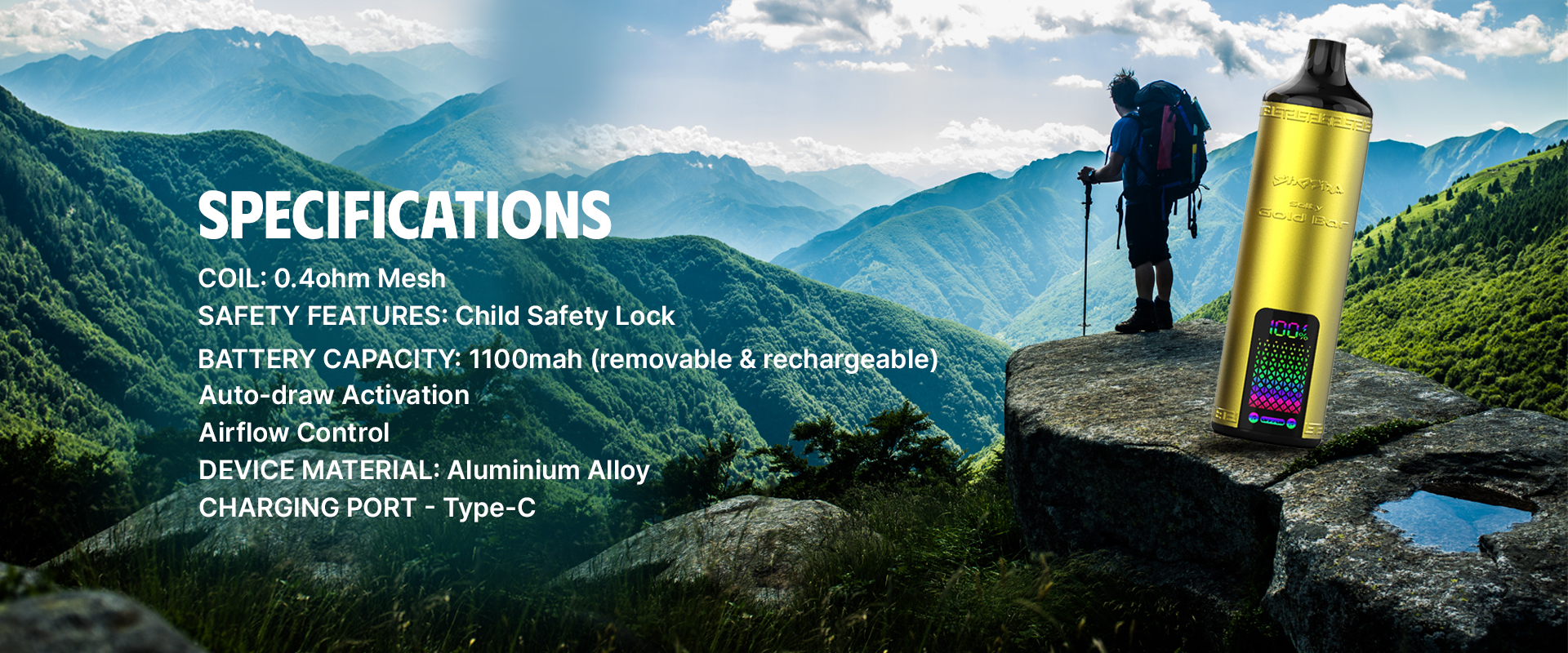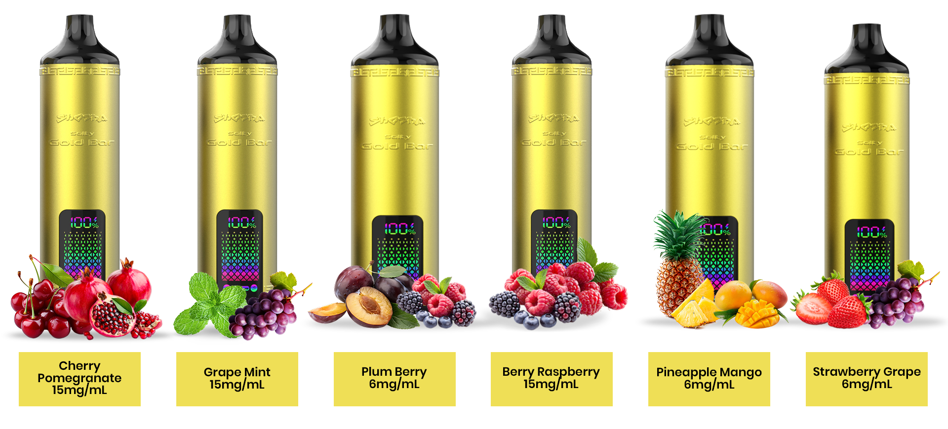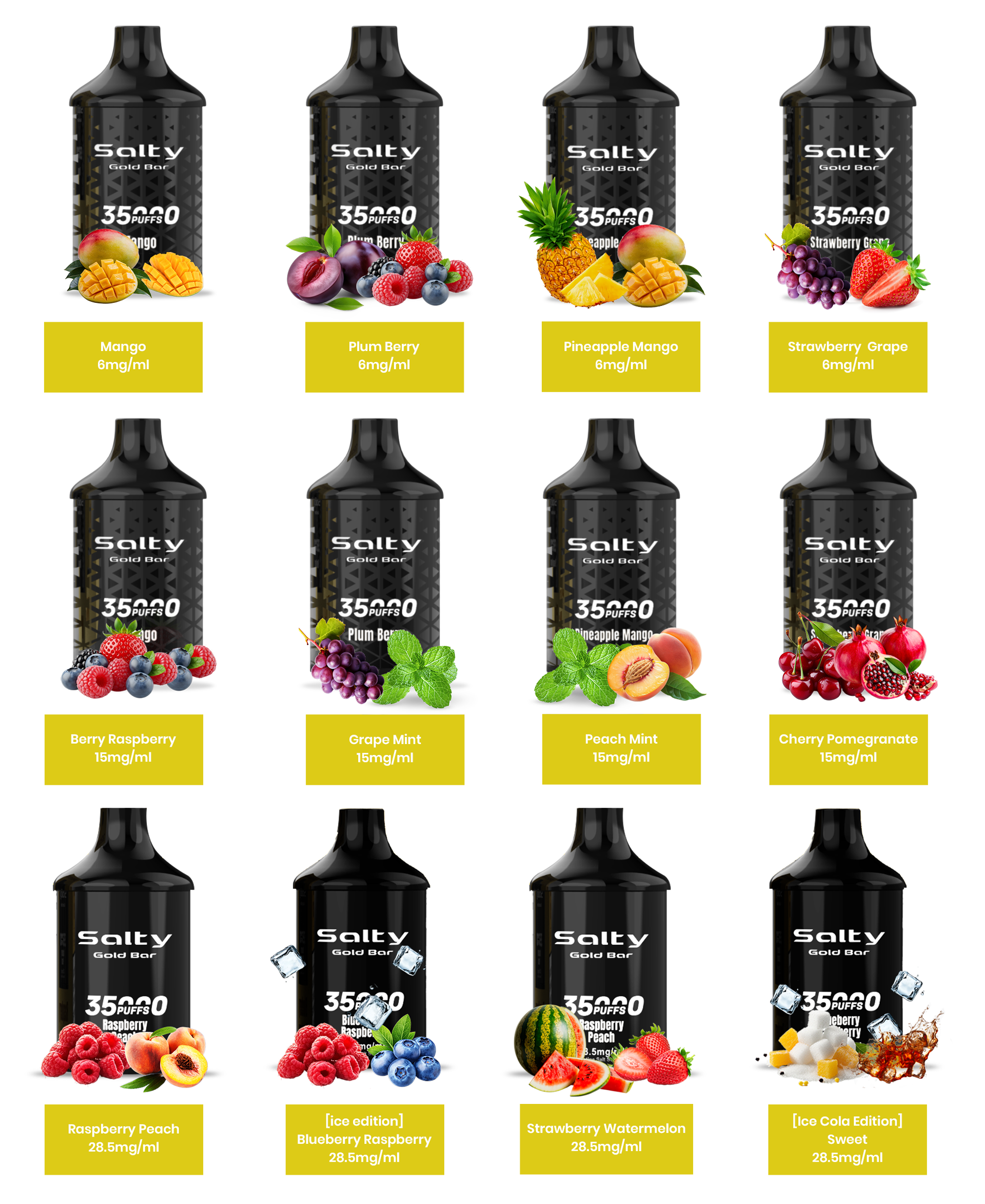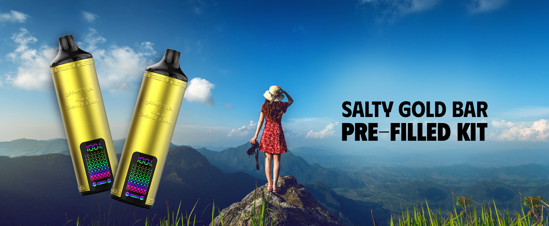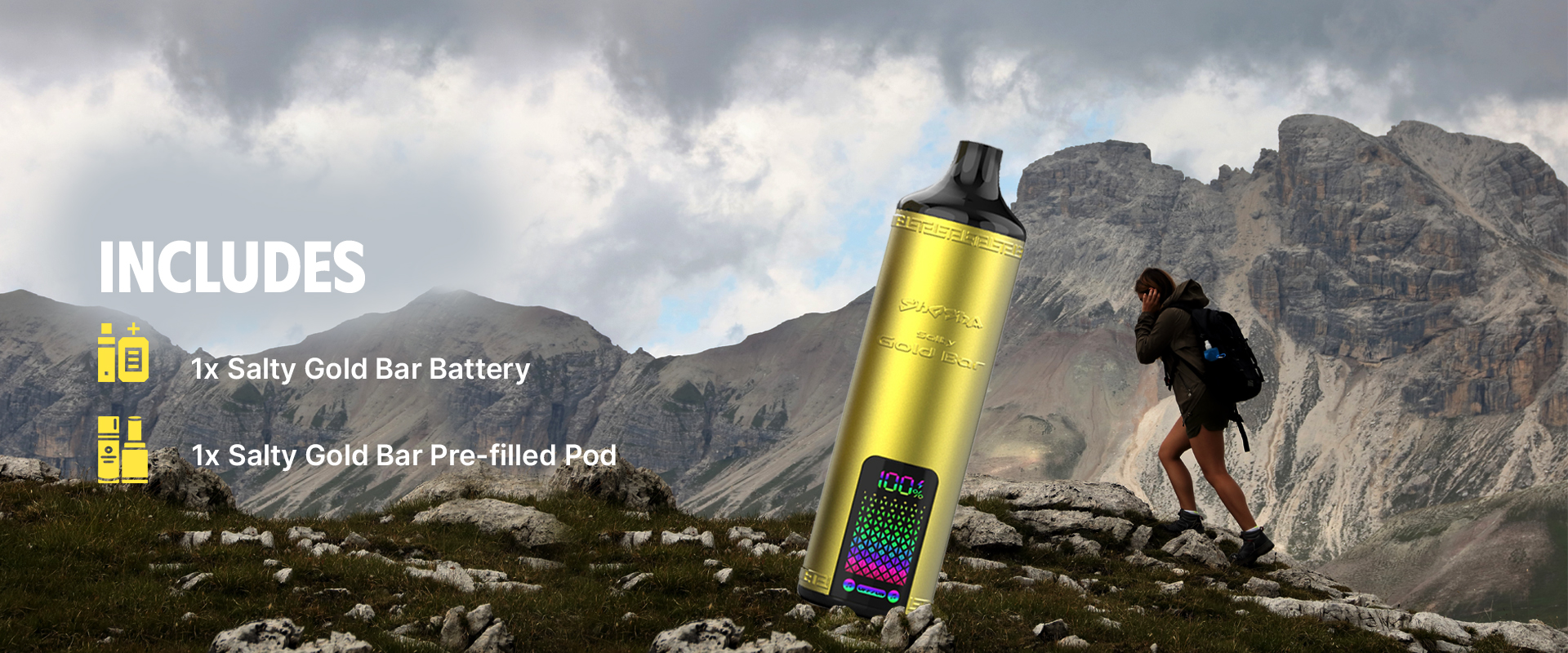 Salty Gold Bar Disposable Vape features auto-draw activation, adjustable airflow, and a durable aluminium body. Choose between 15mg Sub-Ohm or 6mg Freebase nicotine. Includes a child safety lock, removable 1100mAh rechargeable battery, and fast Type-C charging.