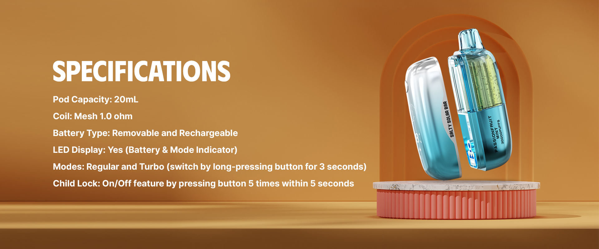The Salty Solar Bar Pre-filled Kit delivers powerful performance with up to 30,000 puffs, a 1000mAh removable battery, and a 50mg/mL pre-installed pod. Its 1.0Ω mesh coil provides rich, consistent flavour, while the LED display, Regular/Turbo modes, and child-lock feature offer a safe, customizable, and user-friendly vaping experience—ready to use straight out of the box.