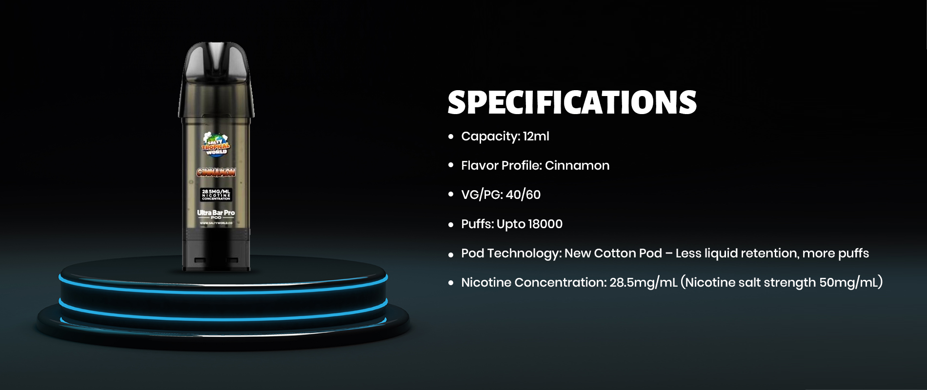 Experience the warm, aromatic kick of pure cinnamon with the Ultra Bar PRO Pre-filled Pod. Featuring a generous 12ml capacity, advanced New Cotton Pod technology, and up to 18,000 smooth puffs, this 28.5mg/mL nicotine salt pod delivers consistent flavor and satisfying performance. Compatible with Ultra Bar PRO devices.